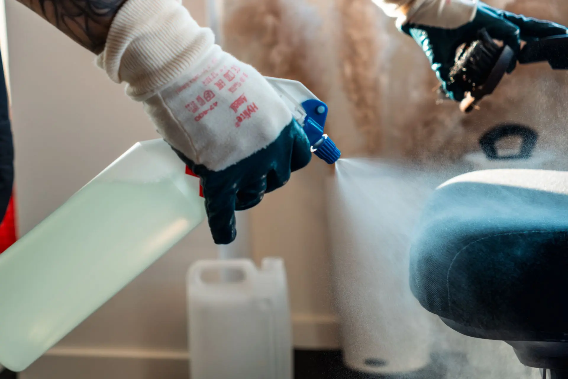 Het reinigingsmiddel wordt nauwkeurig aangebracht, met extra zorg voor zichtbare vlekken, om deze grondig en effectief te behandelen met onze antibacteriële producten.